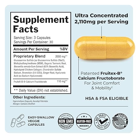 Thông tin sản phẩm Glucosamine Chondroitin MSM Joint Support Supplement - Collagen Peptides, Turmeric and Ginger, Hyaluronic Acid, Glucosamine Chondroitin Sulfate for Joint Comfort - Gluten Free, Non GMO, 90 Capsules