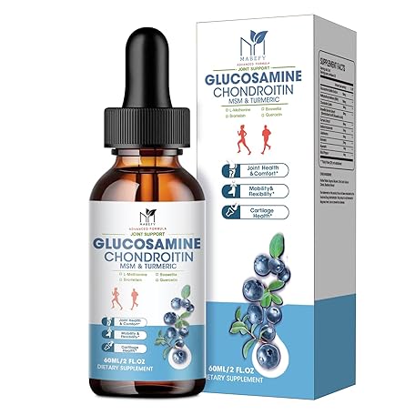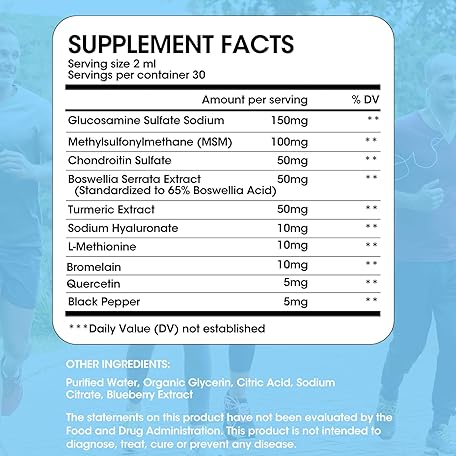 Glucosamine Chondroitin MSM Liquid Drops - Joint Support Supplement with Turmeric Boswellia, Bromelain, Hyaluronic Acid, Relief for Back, Knees & Hands,Blueberry Flavor, 2 Fl Oz