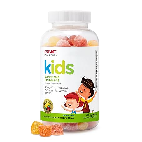 Thông tin sản phẩm GNC Milestones Kids DHA Gummies, Kids Ages 2-12, Omega-3s, Eye and Brain Function & Development, Vitamin A & D, Healthy Teeth & Bones, Gluten Free, No Artificial Flavors, Raspberry Lemon, 120 Gummies
