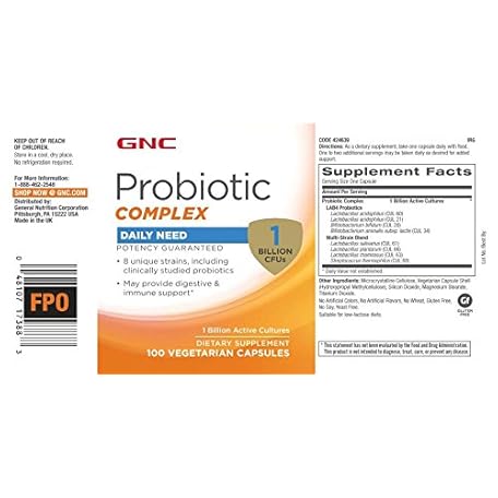 Thông tin sản phẩm GNC Probiotic Complex Daily Need Supplement, Provides Digestive and Immune Support, 1 Billion CFUs, 100 Vegetarian Capsules, 100 Servings