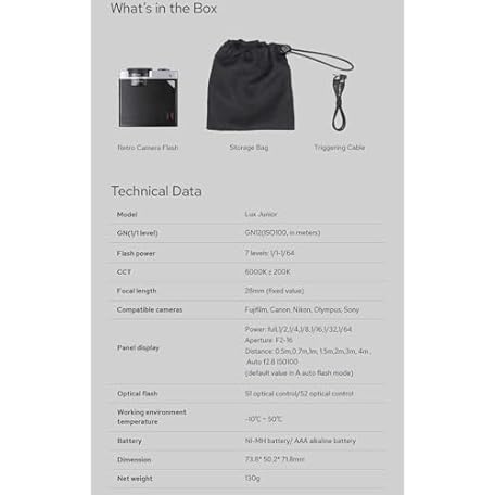 Thông tin sản phẩm GODOX Lux Junior Speedlite Retro Camera Flash, GN12, 6000K CCT A/M Flash Mode, 28mm Focal Length Compatible with Canon Nikon Sony Fujufilm Digital Film Cameras