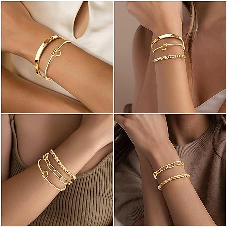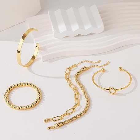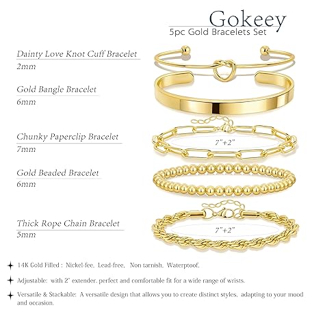 Thông tin sản phẩm Gokeey Christmas Gold Bracelets for Women Non Tarnish, 14K Gold Plated Chunky Cuff Bracelet Stackable Gold Bangles Bracelet for Women Trendy Tie Knot Cuban Rope Paperclip Beaded Bracelet Stack Jewelry Stocking Stuffer Gifts Fashion Accessories