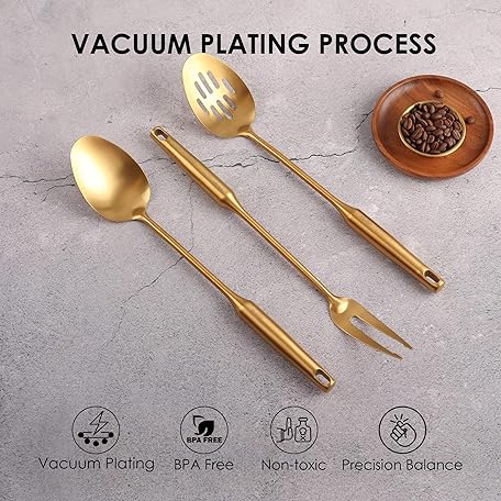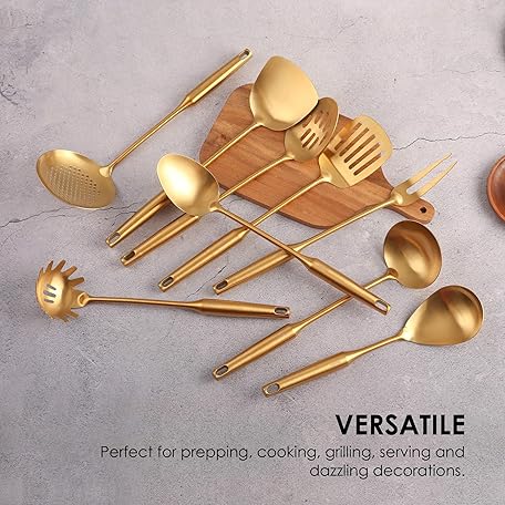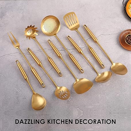 Thông tin sản phẩm Gold Kitchen Utensils Set - 18/10 Stainless Steel Cooking Tools, 15" All Metal Serving Utensils with Fork, Solid/Slotted Spoon, Spatula, Ladle, Skimmer, Tunner, Pasta Spoon, Large Spoon, Set of 9