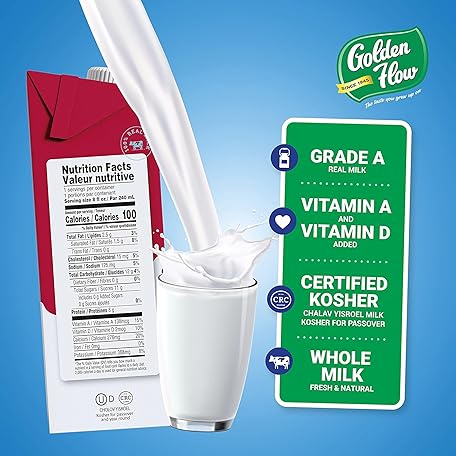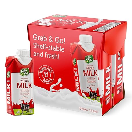 Golden Flow Shelf-Stable Whole Milk - Grade A UHT 8 oz Boxes, Fortified with Vitamin A & D, No Refrig Needed - Kosher Cholov Yisroel & Kosher for Passover (KFP) - Travel & Lunchbox Friendly - 24 Pack
