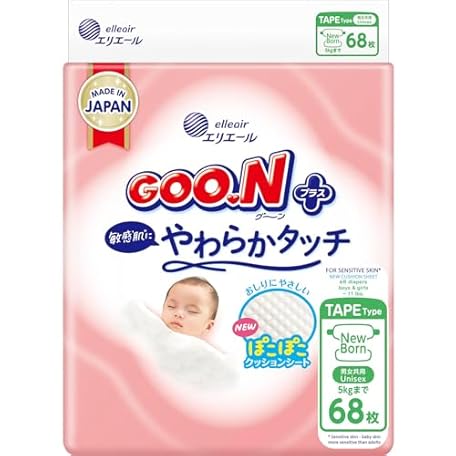GOO.N Plus+ Diapers Newborn/XS Size (up to 11 lb) Unisex [1-Pack] 68 Count Tape Straps Sensitive Skin, Made in Japan