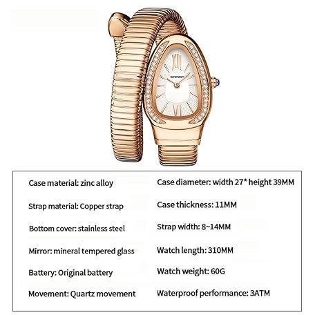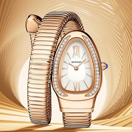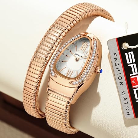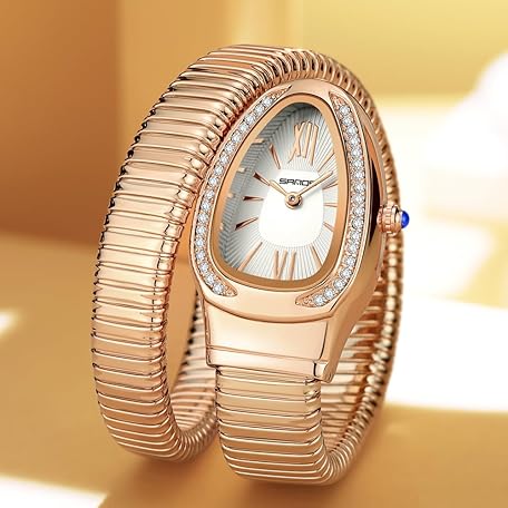 • Gosasa Stylish Women's Snake Shape Bangle Watch Unique Design Snake Coil Elegant Dress Diamond Bracelet Ladies Quartz Wristwatch with Roman Numerals Dial