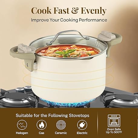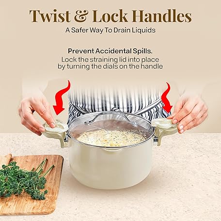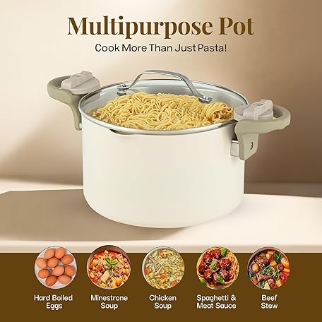 Thông tin sản phẩm GOTHAM STEEL 5 Qt Ceramic Stock Pot Multipurpose Pasta Pot with Strainer Lid & Twist and Lock Handles, Nonstick Ceramic Pot for Soup, Spaghetti, Rice, Pots for Kitchen, Dishwasher Safe - Cream