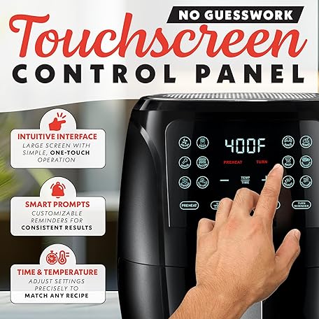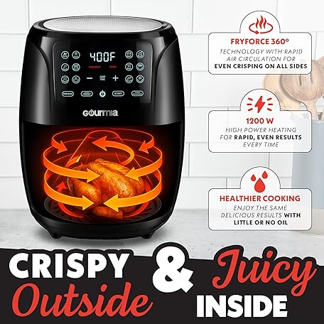 Thông tin sản phẩm Gourmia Air Fryer - 6 Qt Large Capacity, FryForce 360º, Digital Display with 12 Presets, Roast, Bake, Broil, Dehydrate, Dishwasher Safe Accessories, Black