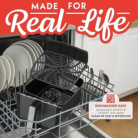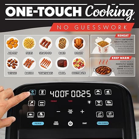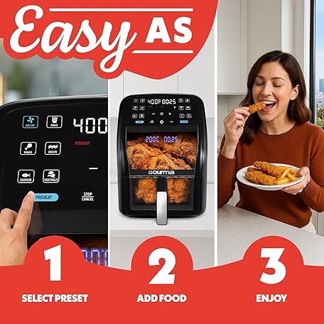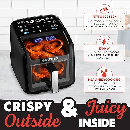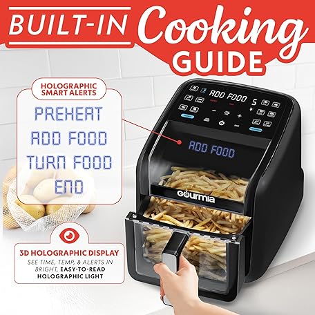 Thông tin sản phẩm Gourmia Air Fryer 7 QT - Easy View Panoramic Window & Interior Light, Guided Cooking with 12 One-Touch Presets, FryForce 360, Dishwasher Safe Accessories, Black