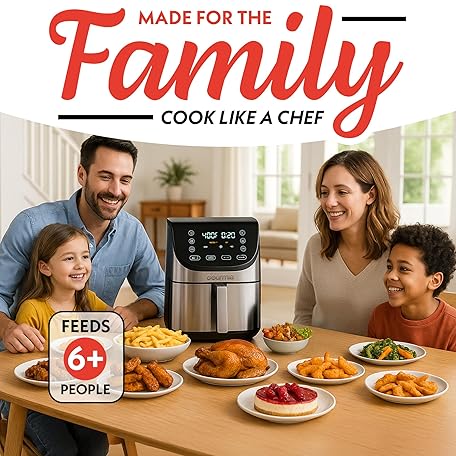 Thông tin sản phẩm Gourmia Air Fryer - 8 Qt Extra Large Capacity, FryForce360º, Digital Display with 12 Presets, Roast, Bake, Broil, Dehydrate, Dishwasher Safe Accessories, Stainless Steel