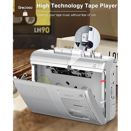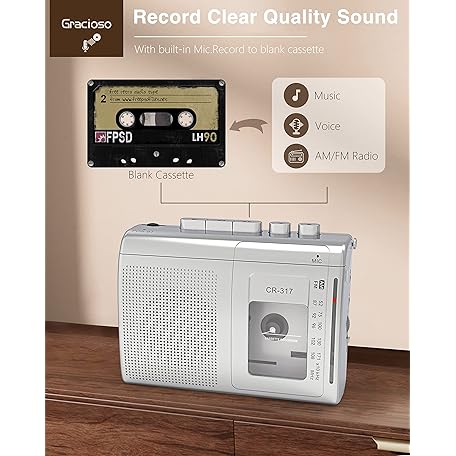 Thông tin sản phẩm Gracioso Bluetooth Cassette Player Recorder with Bluetooth Transmitter, AM FM Cassette Player with Big Speaker,3.5mm Headphone Jack,Microphone Jack, 2*AA Battery Opearated for Home