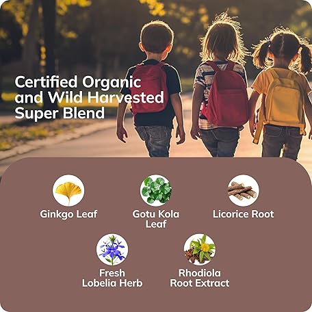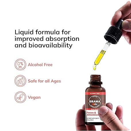 Grama Wellness - Focus & Attention Organic Kids Brain Vitamins & Cognitive Support Drops, ADHD Supplement with Ginkgo Biloba, Rhodiola, Gotu Kola, Licorice Root | Made in USA – 30 Servings