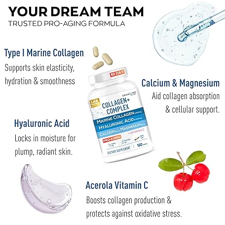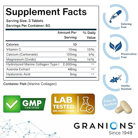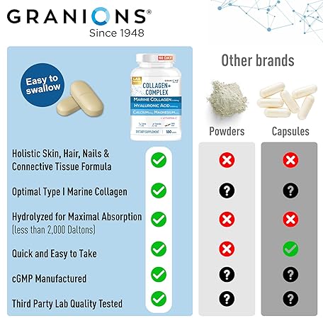 Thông tin sản phẩm Granions Marine Collagen Pills – 2000mg Hydrolyzed Marine Collagen Peptides, Hyaluronic Acid, Vitamin C, Calcium, Magnesium – Skin, Hair, Nails, Pro Aging Hyaluronic Acid Supplements – 180 Tablets