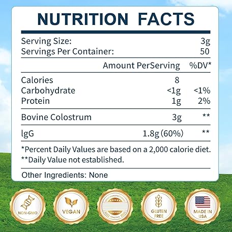Thông tin sản phẩm Grass-Fed Bovine Colostrum Supplement Powder - 60% High IgG 3000 mg for Gut Health, Immune Support - Easy to Mix Natural Liposomal Colostrum Superfood, Unflavored, 50 Servings