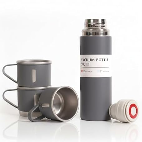 Gray Vacuum Flask Set, Stainless Steel Insulated Water Bottle w/ 3 Cups, Coffee Thermo Water Bottle for Hot & Cold Drinks, Reusable Thermal Cup for Outdoor Camping Travel, Termos para Agua Fria (17oz)