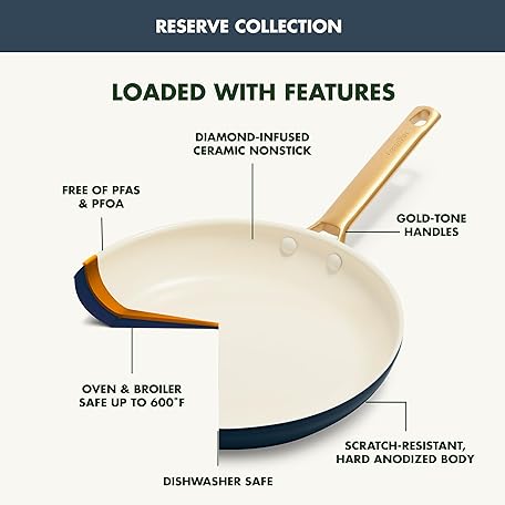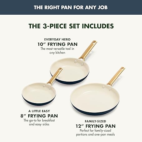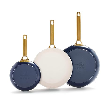 Thương hiệu GreenPan là cái tên nổi tiếng được rất nhiều khách hàng trên thế giới chọn lựa. Với kiểu dáng đẹp mắt, sang trọng, sản phẩm GreenPan Hard Anodized Healthy Ceramic Nonstick 8" 10" and 12" 3 Piece Frying Pan Skillet Set, Gold Handle, Induction, PFAS-Free, Dishwasher Safe, Oven Safe, Twilight Blue là sự lựa chọn hoàn hảo nếu bạn đang tìm mua một món cho riêng mình.