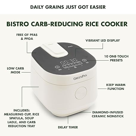 GreenPan Rice Cooker, 8 Cups Cooked (4 Uncooked), Low-Carb & Soup Mode,10 ONE-TOUCH Cooking Presets, PFAS-Free Ceramic Steamer Basket, Fuzzy Logic, Auto Keep Warm, Oats, 24HR Delay Timer, Cream