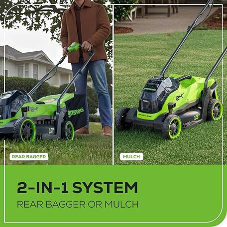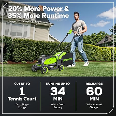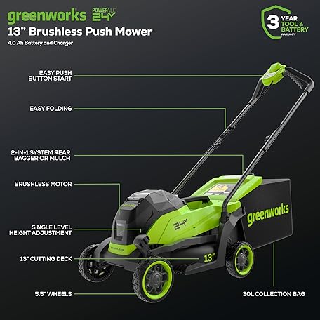 • Greenworks 24V 13" Brushless (Push) Cordless Lawn Mower, 4.0Ah Battery and Charger