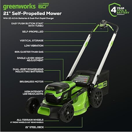 Thông tin sản phẩm Greenworks 60V 21" Self-Propelled Cordless Lawn Mower, Brushless Motor, LED Lights, Includes 2X 4.0Ah Batteries & Rapid Dual-Port Charger(75+ Tool Compatibility, 45Min Runtime)