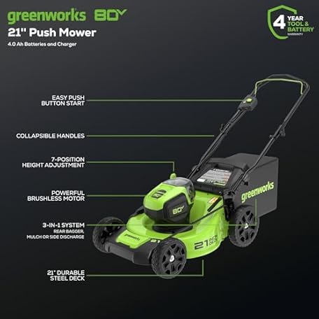 Thương hiệu Greenworks là cái tên nổi tiếng được rất nhiều khách hàng trên thế giới chọn lựa. Với kiểu dáng đẹp mắt, sang trọng, sản phẩm Greenworks 80V 21" Brushless Cordless (Push) Lawn Mower (75+ Compatible Tools), 4.0Ah Battery and 60 Minute Rapid Charger Included là sự lựa chọn hoàn hảo nếu bạn đang tìm mua một món cho riêng mình.