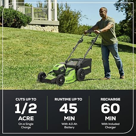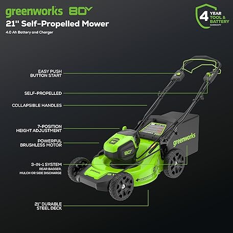 Thương hiệu Greenworks là cái tên nổi tiếng được rất nhiều khách hàng trên thế giới chọn lựa. Với kiểu dáng đẹp mắt, sang trọng, sản phẩm Greenworks 80V 21" Brushless Cordless (Self-Propelled) Lawn Mower (75+ Compatible Tools), 4.0Ah Battery and 60 Minute Rapid Charger Included là sự lựa chọn hoàn hảo nếu bạn đang tìm mua một món cho riêng mình.