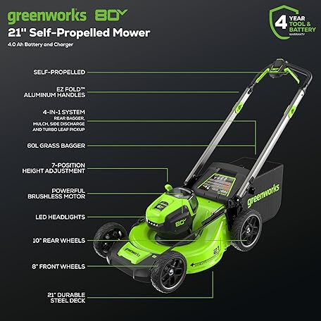 Thông tin sản phẩm Greenworks 80V 21" Self-Propelled Cordless Lawn Mower – Brushless Motor, LED Lights, 4.0Ah Battery & Rapid Charger (75+ Compatible Tools)