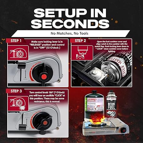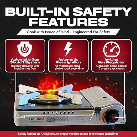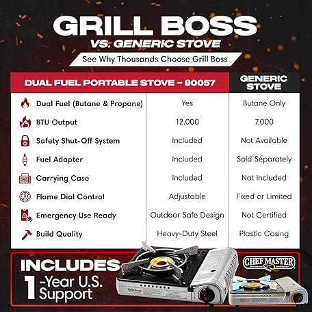 Thông tin sản phẩm Grill Boss Dual Fuel Camp Stove - 12,000 BTU Butane & Propane Portable Stoves for Camping, Emergencies, BBQ, Hiking & Backpacking - Double Wind Guard, Instant Piezo Ignition System - 90057