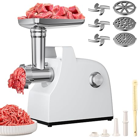 GuanQiao Upgraded Electric Meat Grinder: 3000W Max For Home Kitchen, With Handle. Heavy Duty Mincer Machine, 3 Blades, 3 Plates, Sausage Stuffer Tubes & Kubbe Kit (White)