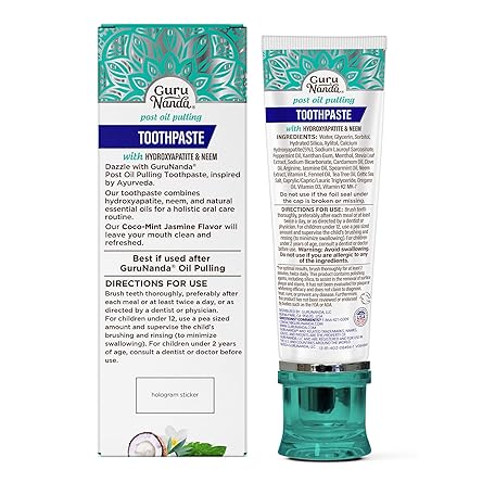 Thông tin sản phẩm GuruNanda Hydroxyapatite Toothpaste, SLS & Fluoride Free, Whitening Toothpaste with Tongue Scraper & Squeezer - Freshens Breath, Fights Plaque - Natural CocoMint Jasmine Neem, 4.2oz