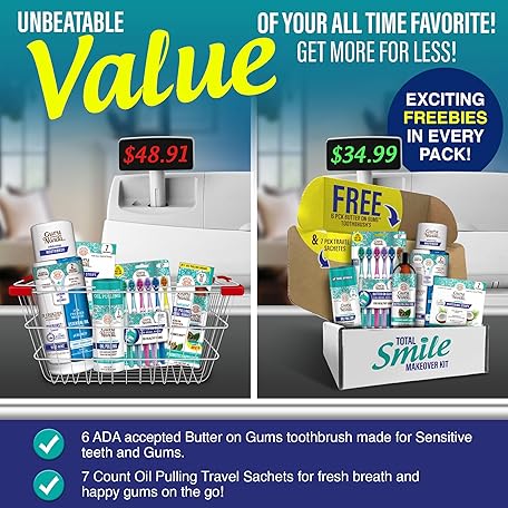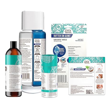 Thông tin sản phẩm GuruNanda Total Smile Makeover Kit Regular with Cocomint Oil Pulling, Dual Barrel Whitening Mouthwash, Whitening Strips & Butter on Gums Toothbrushes