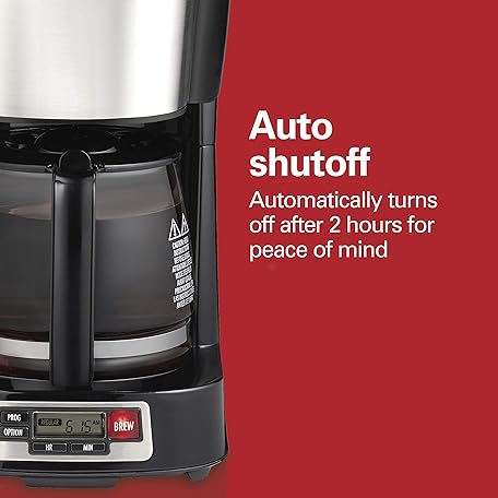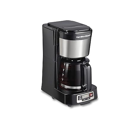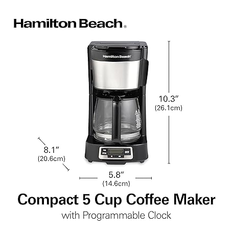 Thông tin sản phẩm Hamilton Beach 5 Cup Drip Coffee Maker with Easy FrontFill Basket, Compact Design, Programmable Clock, Glass Carafe, Auto Pause and Pour, Black & Stainless Steel (46111)