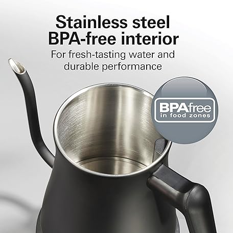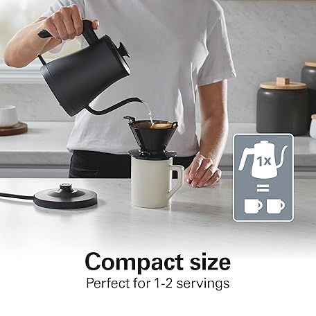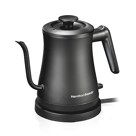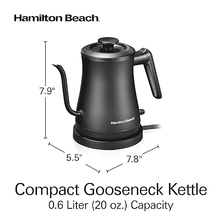 Thông tin sản phẩm Hamilton Beach Compact 20 oz. / 0.6 Liter Gooseneck Electric Kettle for Boiling Water, Pour Over Coffee, Tea, Ultra Fast Heating With 1200 Watts, Stainless Steel BPA-Free Interior, Black (41045)