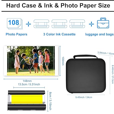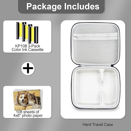Thông tin sản phẩm Hard Storage Case & KP-108IN 3 Color Ink & 108 Sheets 108 Sheets Glossy 4x6 Photo Paper Compatible for Canon SELPHY CP1300/CP1200/CP1500 Wireless Compact Color Photo Printer (Balck case,Ink and Paper)