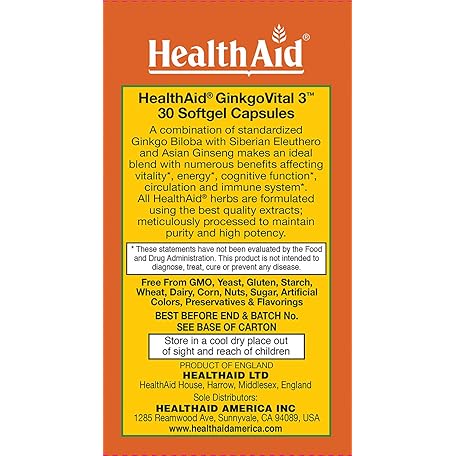 Thông tin sản phẩm HealthAid Ginkgo Vital 3 – Once-Daily Softgel with Ginkgo Biloba, Siberian Eleuthero & Korean Ginseng | Supports Mental Clarity & Circulation | 30 Softgels