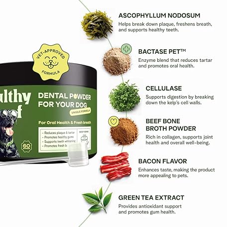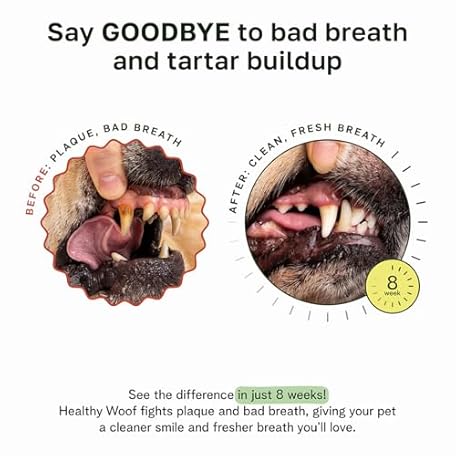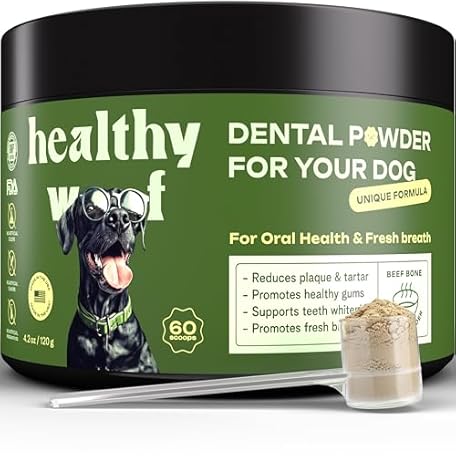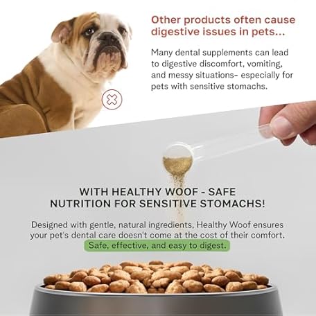 Thông tin sản phẩm Healthy Woof Dental Powder for Dogs - Complete Oral Care Bone Broth, Dog Teeth Cleaning Powder, Tartar Remover, Fresh Breath, Sensitive Stomach Support, No Brush Dental Care, 4.2 oz, 60 Scoops