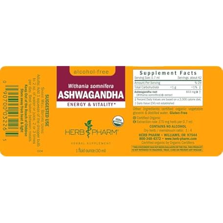 Thông tin sản phẩm Herb Pharm Organic Ashwagandha Liquid Extract, Alcohol-Free: Mood Support Supplement, Vegan Ashwagandha Root Glycerite, Tasty Non-Bitter Adaptogen Extract for Adults, Non-GMO, 1 Oz