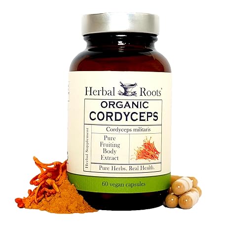 • Herbal Roots Organic Cordyceps - Fruiting Body Extract Mushroom Capsules - Immune & Energy Support - 60 Vegan Capsules