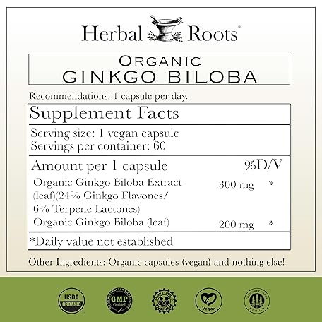 Sản phẩm Herbal Roots Organic Ginkgo Biloba Made with Pure Organic Ginkgo Leaf and Extract - 60 Vegan Capsules đang được bán với giá ưu đãi là $25.2771 tại nước Mỹ.