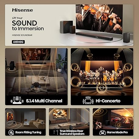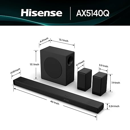 Hisense AX5140Q 5.1.4Ch Sound Bar with Wireless Subwoofer, Dolby Atmos, DTS:X, Bluetooth 5.3, Roku TV Ready, HDMI/AUX/ARC/Optical/USB, EzPlay, 7 EQ Modes, Hi Concerto, Room Calibration