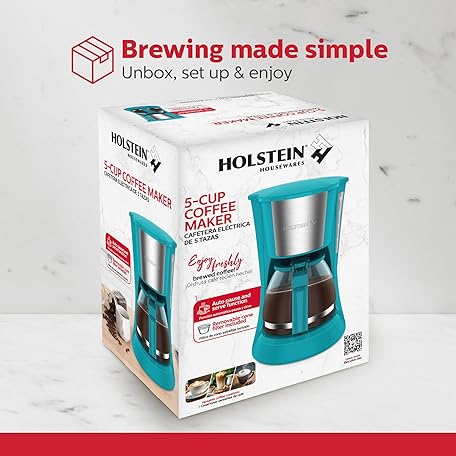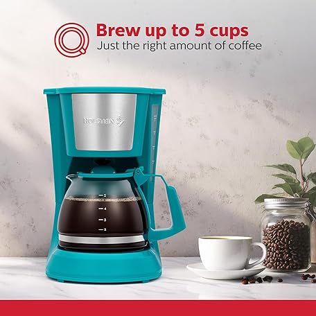 Thông tin sản phẩm Holstein Housewares 5 Cup Drip Coffee Maker – Compact and User-Friendly with Auto Pause & Serve, Reusable Filter, Measuring Spoon & Glass Carafe, Office & Dorm Use, Teal