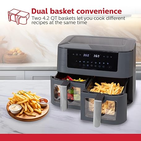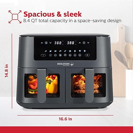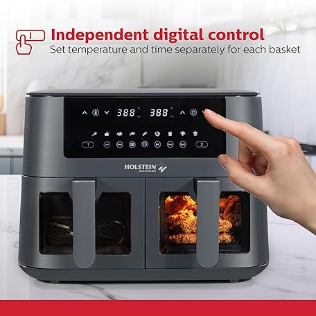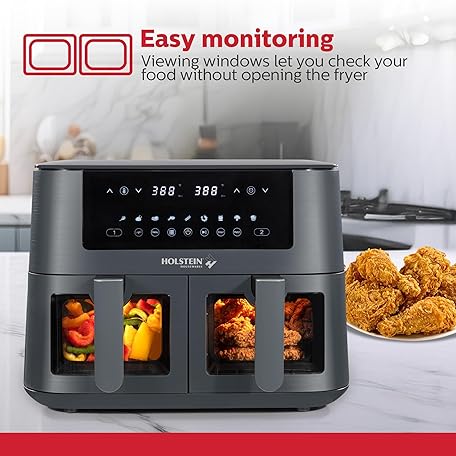 Thông tin sản phẩm Holstein Housewares 8.4QT Dual Basket Digital Air Fryer with viewing window and led display with 7 preset options. Fry, bake, grill, dehydrate, and roast healthier recipes. Dishwasher Safe