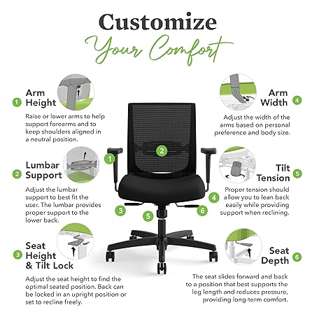 Thông tin sản phẩm HON Convergence Ergonomic Office Chair, Breathable Back Support Mesh, Adjustable Arms, Computer Chair with Lumbar Support, Rolling Swivel Wheels, Comfortable Synchro-Tilt Recline, Fabric, Black