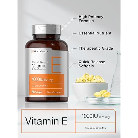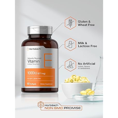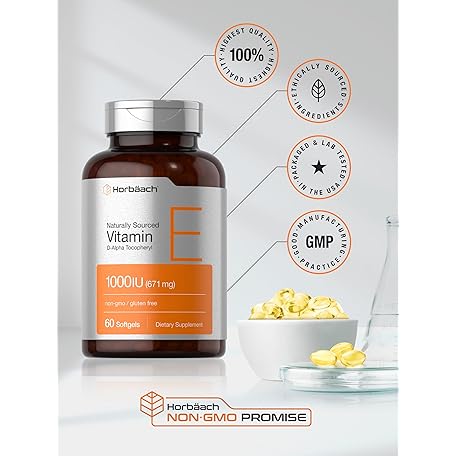 Horbäach Vitamin E 1000 iu Softgels | 671mg | 60 Count | Non-GMO and Gluten Free Naturally-Sourced Formula | D-Alpha Tocopherol