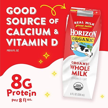 Thông tin sản phẩm Horizon Organic Shelf Stable Whole Milk Boxes, 8 fl oz, 6 Count - 8g Protein per Serving, USDA Organic UHT from Pasture-Raised Cows, Ready to Drink for Lunchbox, Travel, or On-the-Go, No Refrigeration Needed