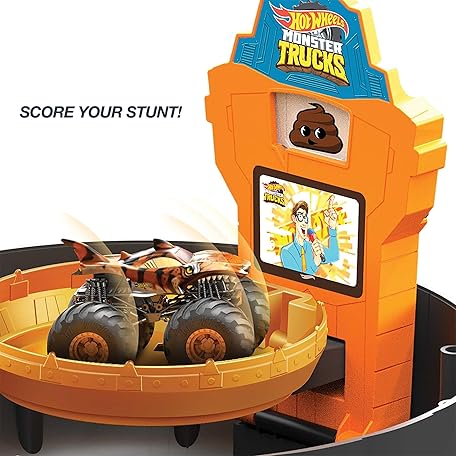 Thông tin sản phẩm Hot Wheels Toy Monster Trucks Playset, Tire-Shaped Case Transforms into Race Course, 3 Trucks & 4 Cars in 1:64 Scale, Stunt Tire (Amazon Exclusive)
