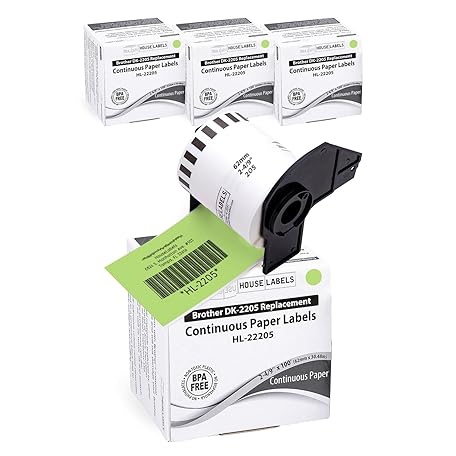 HouseLabels Compatible with DK-2205 Replacement Roll for Brother QL Label Printers; Green Continuous Length Labels; 2-4/9" x 100 feet (62mm*30.48m) with PRELOADED Cartridge - 4 Rolls