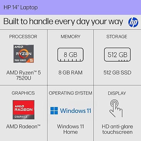 Thông tin sản phẩm HP 14 inch Laptop, HD Touchscreen Display, AMD Ryzen 5 7520U, 8 GB RAM, 512 GB SSD, AMD Radeon Graphics, Windows 11 Home, Natural Silver, 14-em0499nr