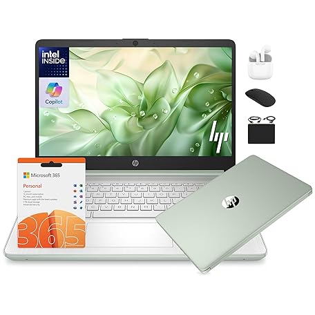 HP 14 Laptop Student Business 2025 Flagship Computer, AI Copilot, 4-Core 13th Gen Intel CPU, 16GB RAM 628GB Storage (128GB UFS+ 500GB Ext), 1-Yr Office 365, Long Battery HubxcelAccessory Win 11S Green