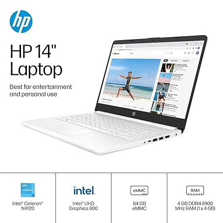 Thông tin sản phẩm HP 14" Ultra Light Laptop for Student & Home (Intel Quad-Core N4120, 4GB RAM, 128GB(64GB + 64GB SD), 1-Year Office 365) 11-Hr Long Battery Life, Webcam, WiFi, Win 11 Home in S Mode - Snow White