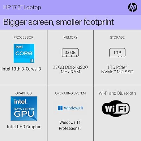 Thông tin sản phẩm HP 17.3 inch Laptop with Lifetime Office 365 for The Web, Intel 13th 8 Cores i3 CPU (Beat 11th i5), 16GB RAM, 256GB SSD Storage, 10 Key Number Pad, Windows 11, No Mouse
